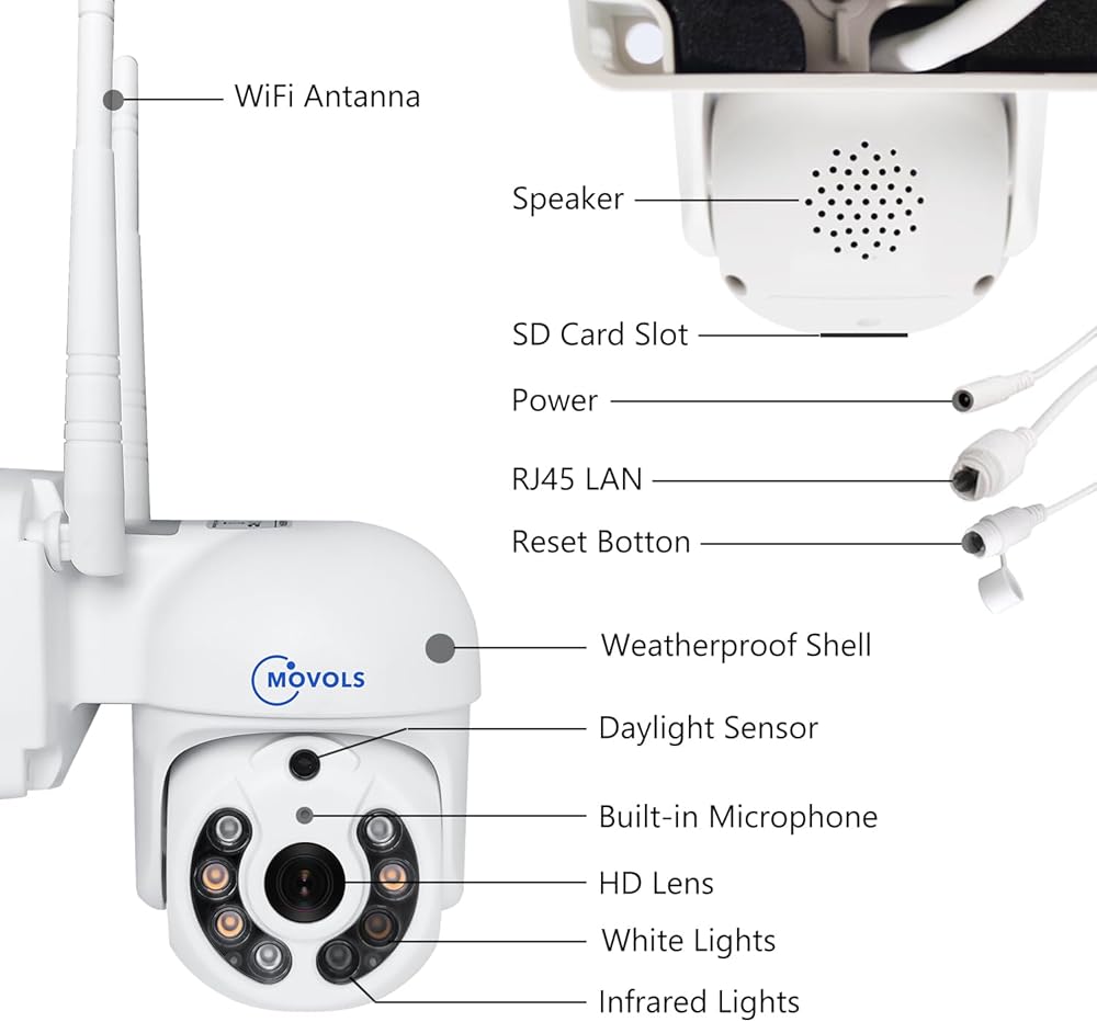 【5MP/2.5K,Pan/Tilt/Digital Zoom】 Adopts 5MP ptz cameras come with 4pcs infrared LEDs and 4pcs white LEDs,ultra clear full glass lens, which presents 2880*1620P 2.5K about 2.5 Times Clearer than 1080P. 5X Digital Zoom for closeup while viewing videos.You can control the 350°horizontal and 90°vertical pan and tilt remotely via phone by App which offers you no blind area vision.With Starlight Sensor, you can see all details within 65 feet even at night.