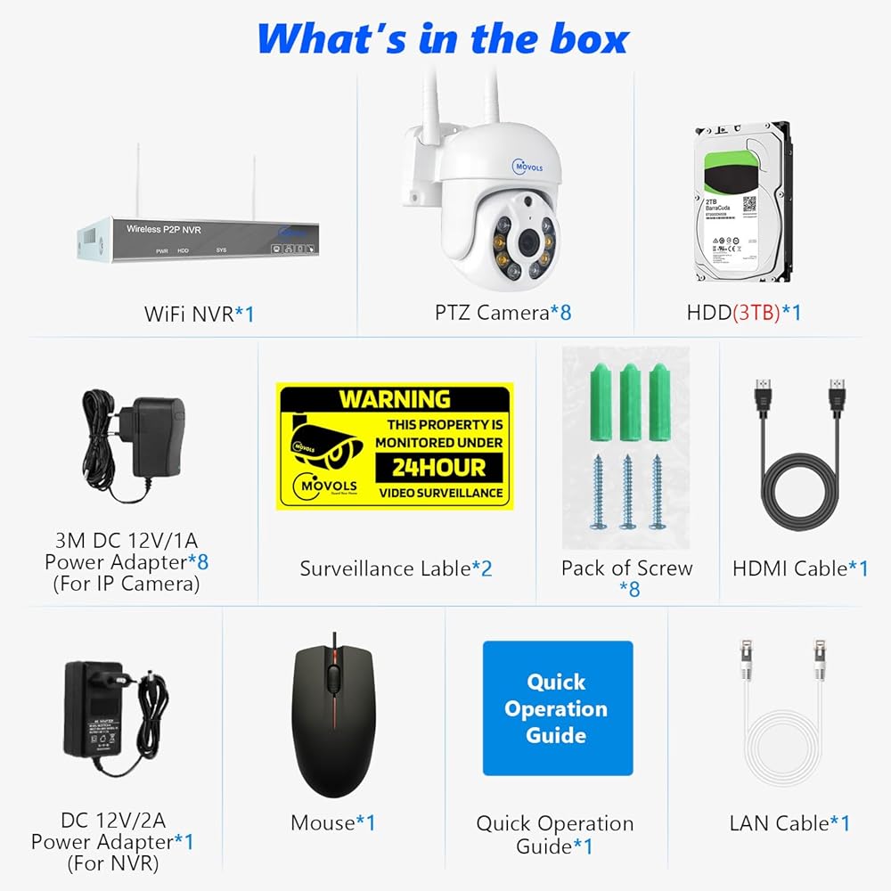 【Easy Installation & Remote View from anywhere anytime】This wifi system includes 10 channel NVR and 8 X 5MP IP66 weatherproof ptz cameras. Free from the hassle of long distance wiring, simply connect the cameras and NVR to the power by the included power adapter, which provides you 2.5K HD footage,even if you travel on anywhere anytime,you can get real-time images of your home and hear family or business.You can watch live or playback video records on your cellphone with built in 2T HDD.