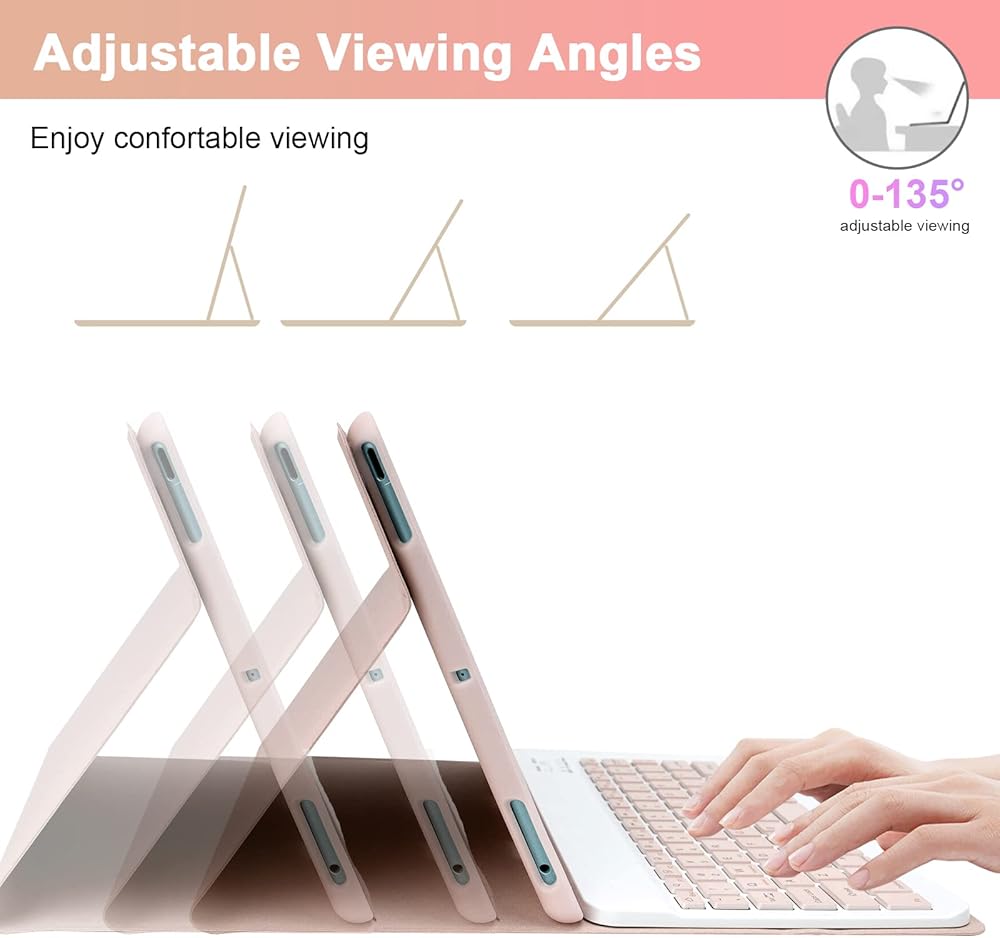 Detachable & Adjustable:Designed to stand your iPad hands free so you can focus on work, reading, watching videos, typing like on normal computer laptop. Innovative magnetically detachable wireless keyboard design makes it easy to use(the connection range is up to 10 M). And iPad protective case can be adjusted to different angles according to your needs, provides more comfortable feeling of use.