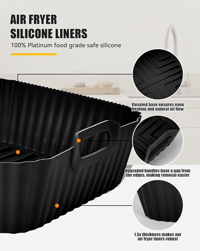 Heat-Proof Handles and Enhanced Air Circulation - MMH air fryer liners silicone, thoughtfully designed with dual handles to safeguard your hands from heat. Featuring innovative groove designs, improving air circulation and heat distribution,to make residual oil or grease to effortlessly drain away. Enjoy healthier cooking without compromise.