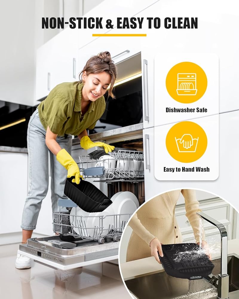 Easy to Clean & Dishwasher Safe - Keep your air fryer clean and enjoy delicious foods. Unique pattern design makes residue oil easily flow out when cleaning. The soft and flexible silicone bottom can be inverted for thorough cleaning, simplifying maintenance tasks. Handwash with warm water, dishwasher safe.