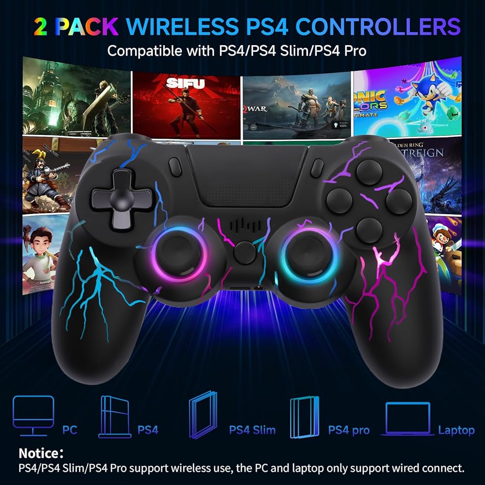 【WIDELY COMPATIBILITY】2 Pack Wireless Controller compatible with PS4/Slim/Pro, allows you to play games on different platforms. (Wired with PC: Please note that the PC can only be used with a wired connection). Convenient and fast connection, PS4 controller support wired usb and wireless bluetooth connections, can be quickly paired and work stably, with almost no compatibility problems and delays. (Note: The first connection to console requires to use the included USB charging cable to activate the device.)
