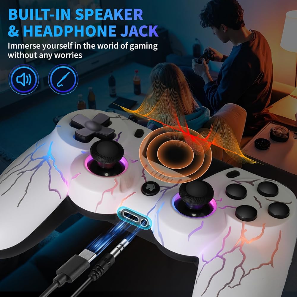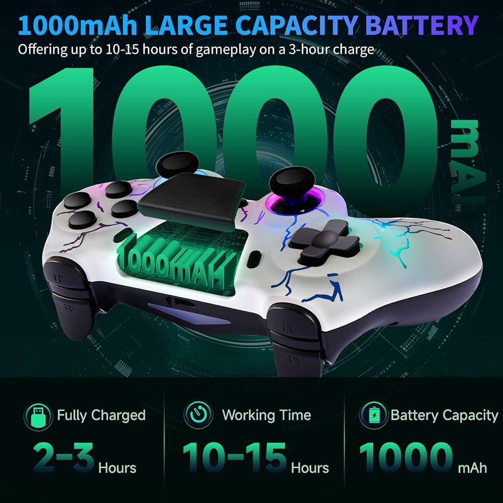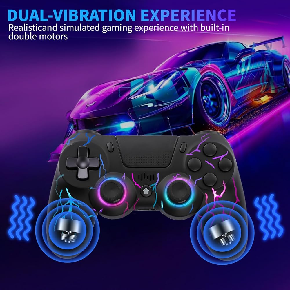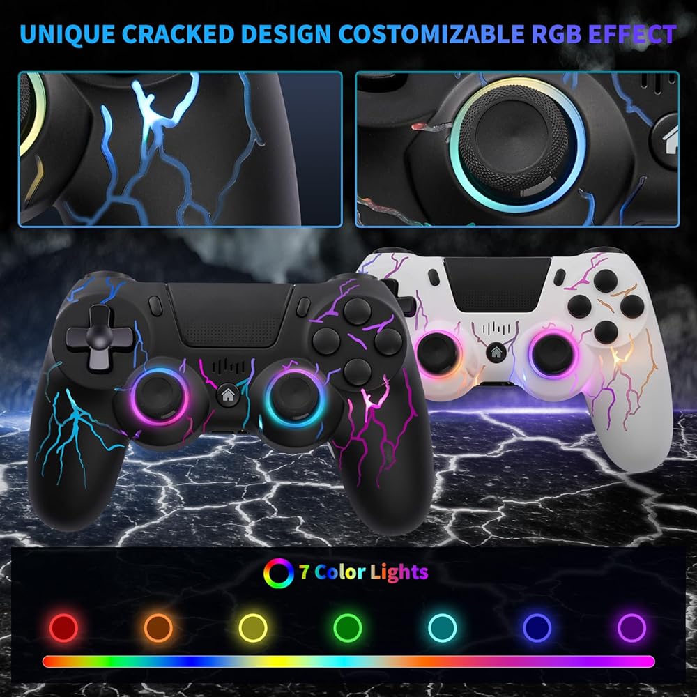 【UNIQUE CRACKED DESIGN& RGB LIGHT】The PS4 wireless controller is covered with crack patterns and RGB light (red, green, blue and other 7 colors of light together), creating a cool gaming lighting atmosphere. Easy to set up, just press the "set" button to switch the color as you like. The ps4 controller is equipped with an advanced chip for ultra-fast response and high sensitivity; back non-slip grip design that eliminates lag and drift.