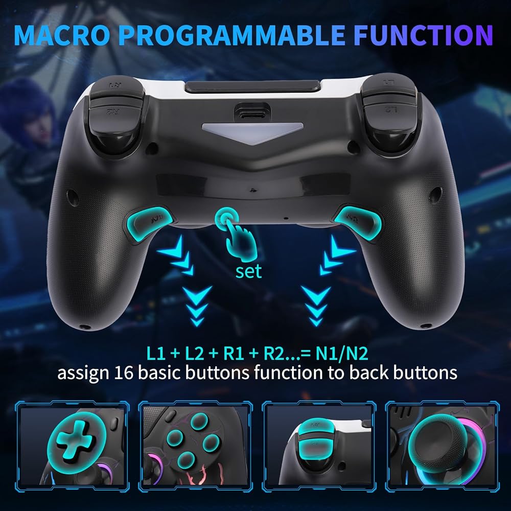 【PROGRAMMABLE FUNCTION】The wireless PS4 controller upgrade designed programmable function, with N1/N2 marco button. Press and hold “Set” button 3s enter into programming. These 2 back buttons assign 1-16 basic buttons (L1+L2+R1+R2....=N1/N2) to be programmed, you can release combo skills with one button to easily defeat bosses to optimize gameplay and release your fingers. More flexible and convenient than other normal controllers.