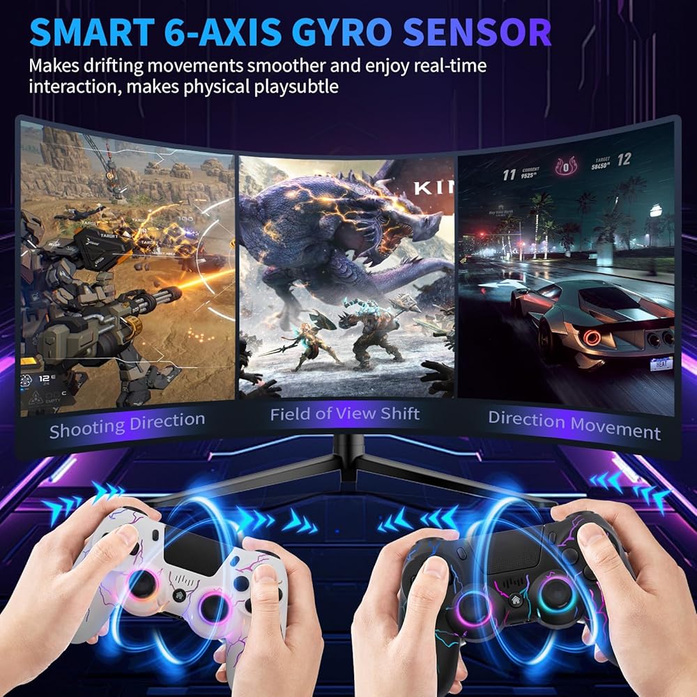 【FUNCTION HIGHLIGHTS】The PS4 pro controller built-in 6-axis gyroscope with adjustable field of view and direction, which allows you to adjust your character's dodging direction by slightly turning the handle to easily avoid enemy attacks. The ps4 controller has dual vibration motors, which can generate different vibration effects according to the game scene, feel the environmental changes in the game in a more detailed way. The touchpad supports multi-touch and gesture operation, can accurately control the direction and range of the character's superpower release by swiping, zooming and other operations.