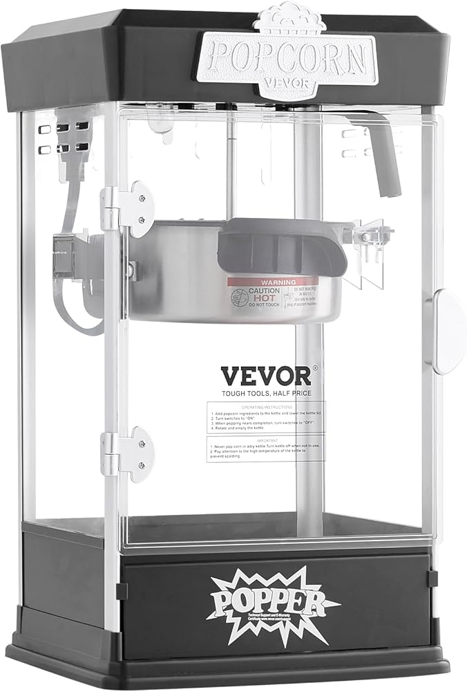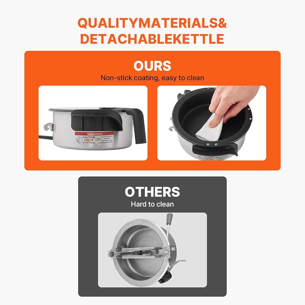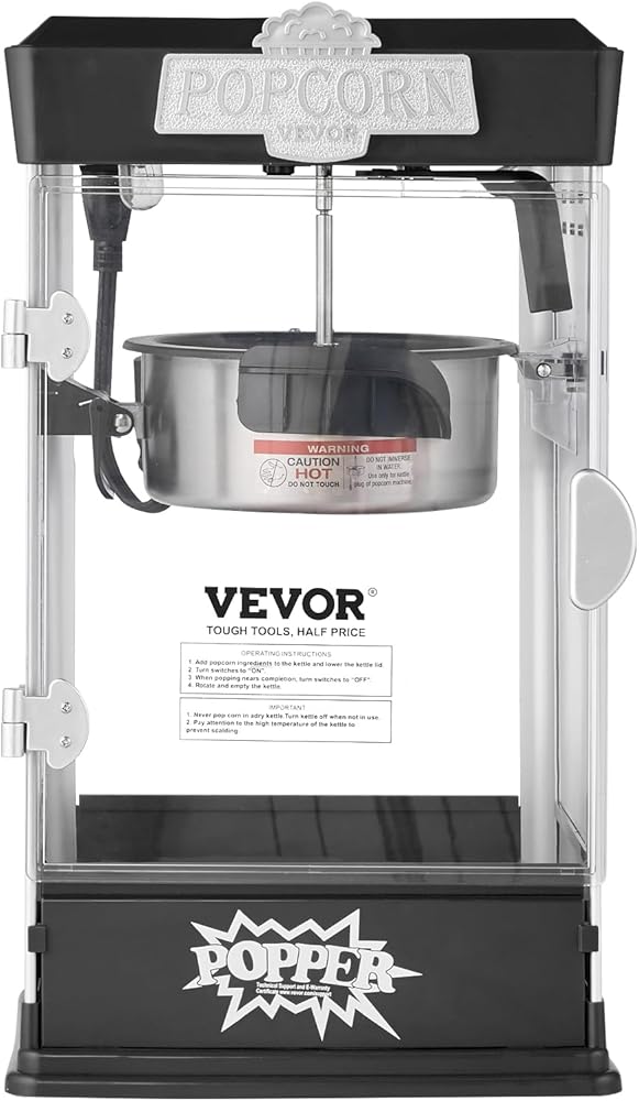 User-Friendly Design: Once the heating tray starts to fill up, simply open the hinged cover below, and the popcorn is right there, ready to scoop out! The removable crumb tray keeps the interior clean, with no scattered kernels. Collecting and disposing of dropped kernels has never been so simple!