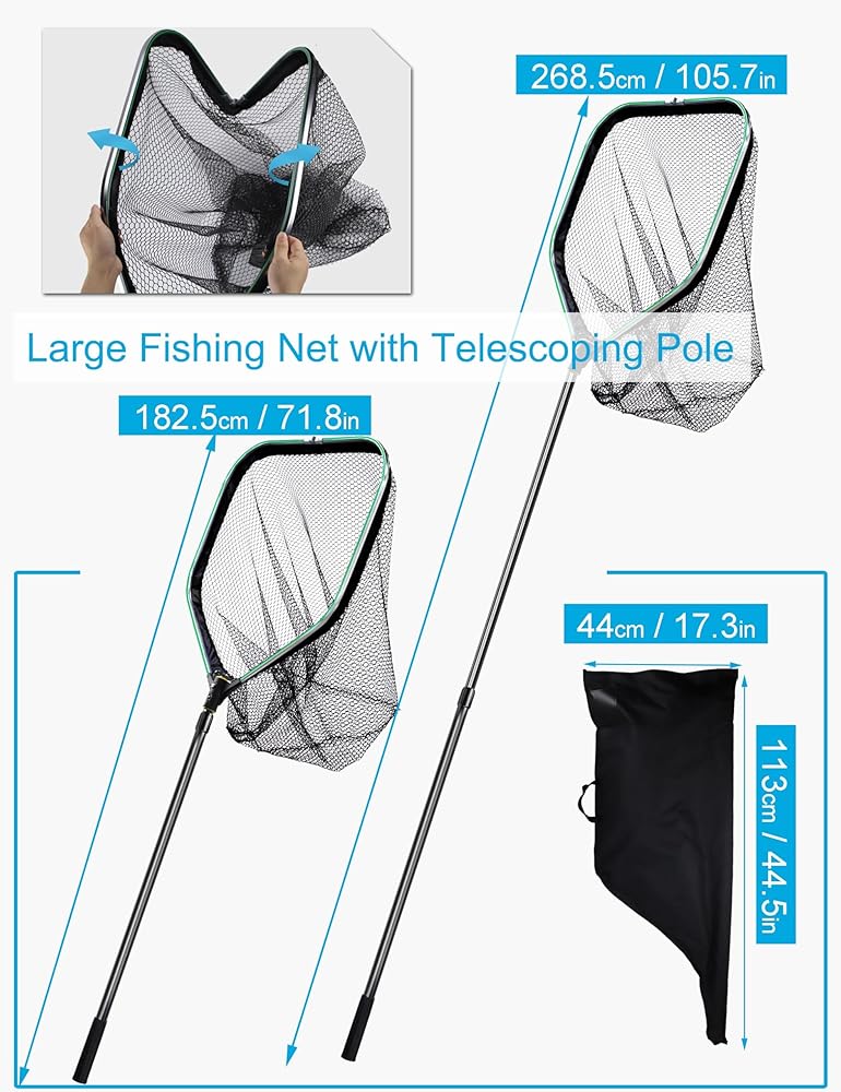 Kayak Fishing Net with Handle: With telescoping handle, the fishing net can extend from 75.8-105.7in, convenient for boat and kayak fishing trips, suitable for both kids and adults to catch fishes.