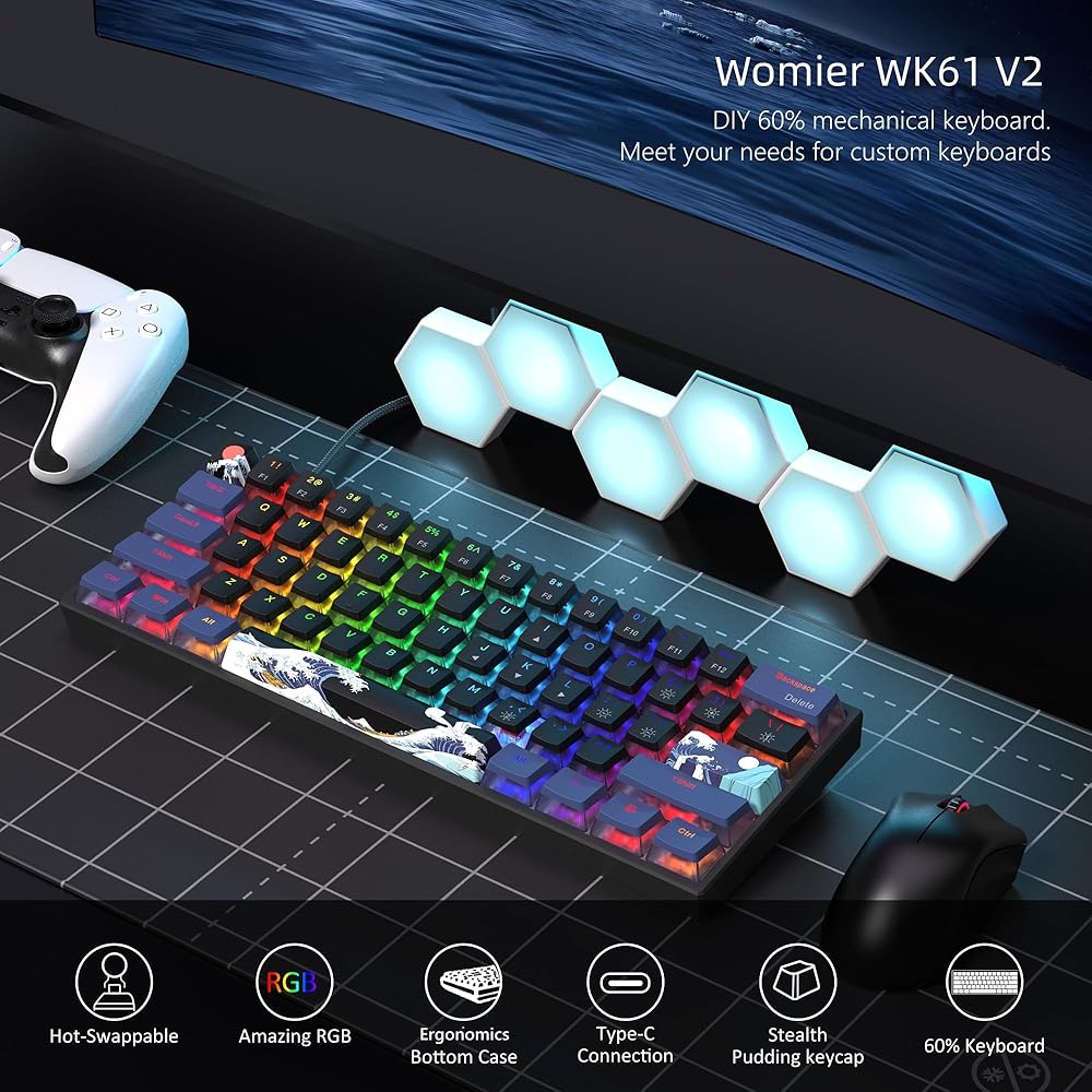 Womier 60% Percent Keyboard Gaming, WK61 V2 Creamy Mechanical Wired Keyboard Anime, Hot-Swappable RGB Key Board with PBT Keycaps for Windows PC Gamers - POM Linear Red Switch(Black Kanagawa)