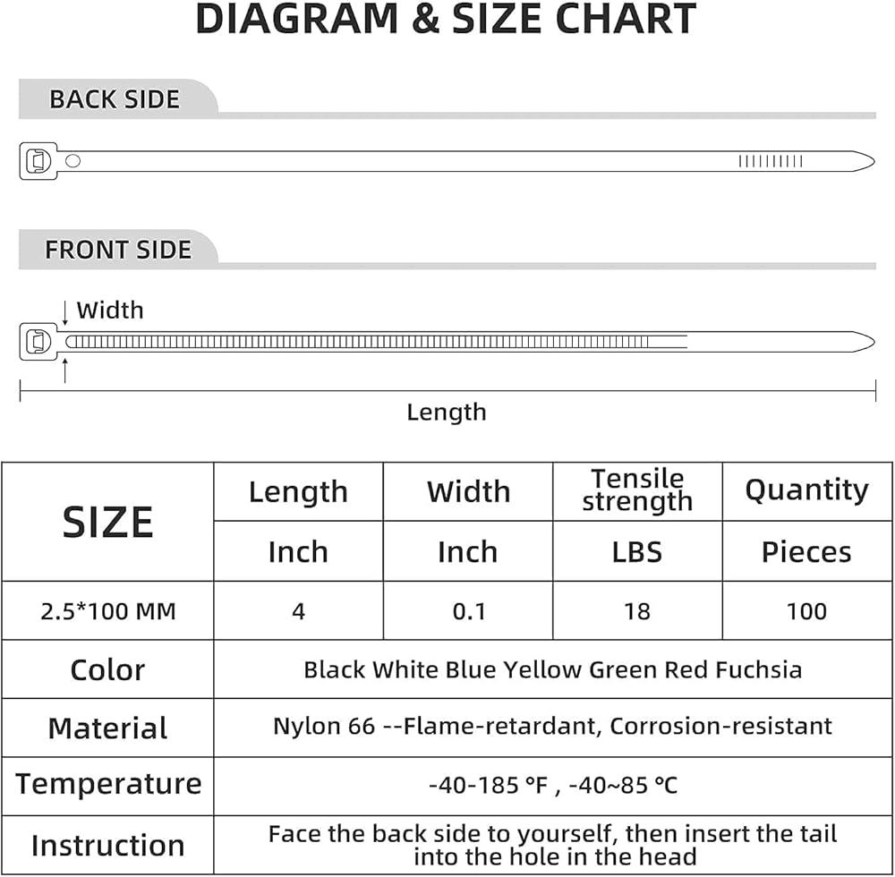 【Excellent Quality】Small Zip Ties are made of high quality PA66 nylon with extremely high toughness and tensile strength, heat resistance and UV resistance. Working Temperature: -40~85℃ / -40~185℉; Maximum Tensile Strength18 lbs
