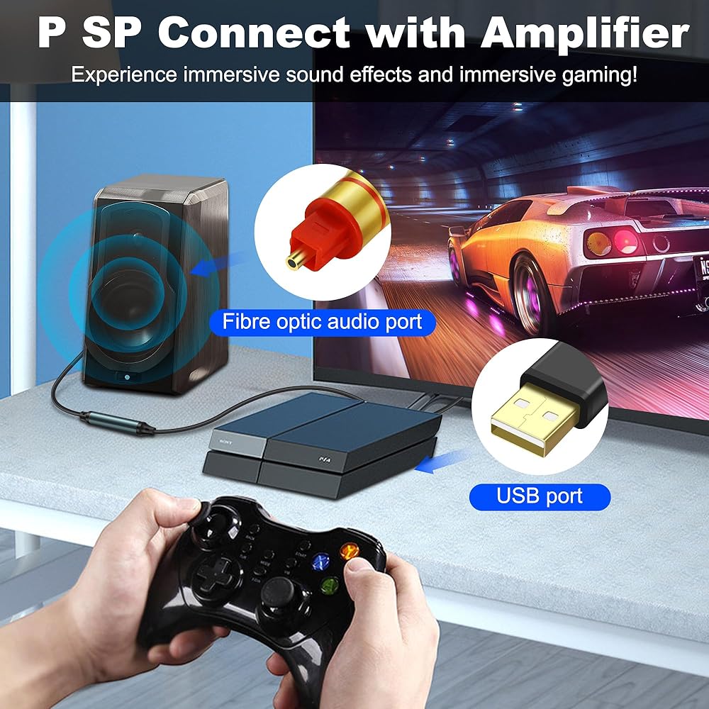 Suitable for a variety of devices, USB connected devices: PS4, notebook, desktop, TV; Fiber optic audio port connection equipment: audio, speakers, power amplifier, echo wall, amplifier, etc. (Please identify each interface before connecting the device)