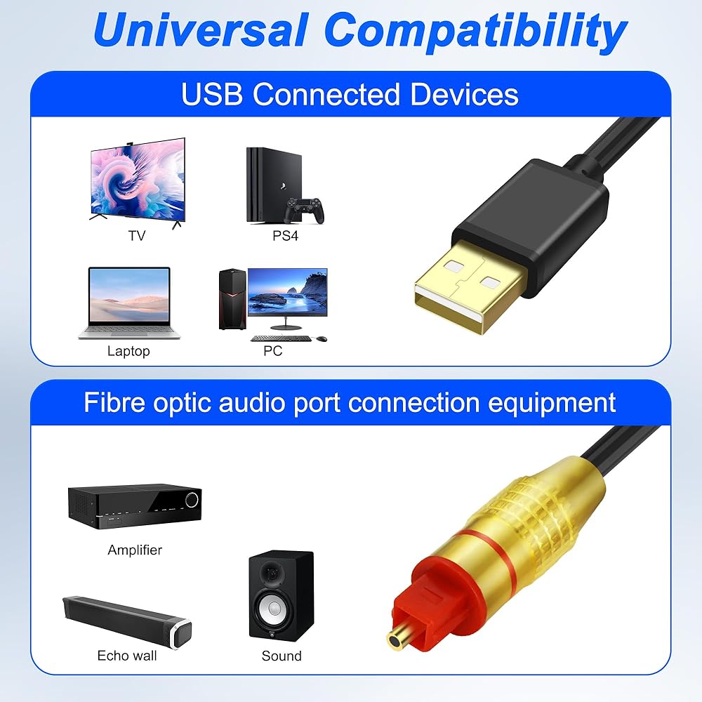 This USB A to fiber optical audio converter connects one end to a USB A port on a laptop, computer, or gaming console, and the other end to an S/PDIF-compatible sound system, providing a high-quality stereo surround sound experience. (Note: Ensure that your device is equipped with a USB interface.)