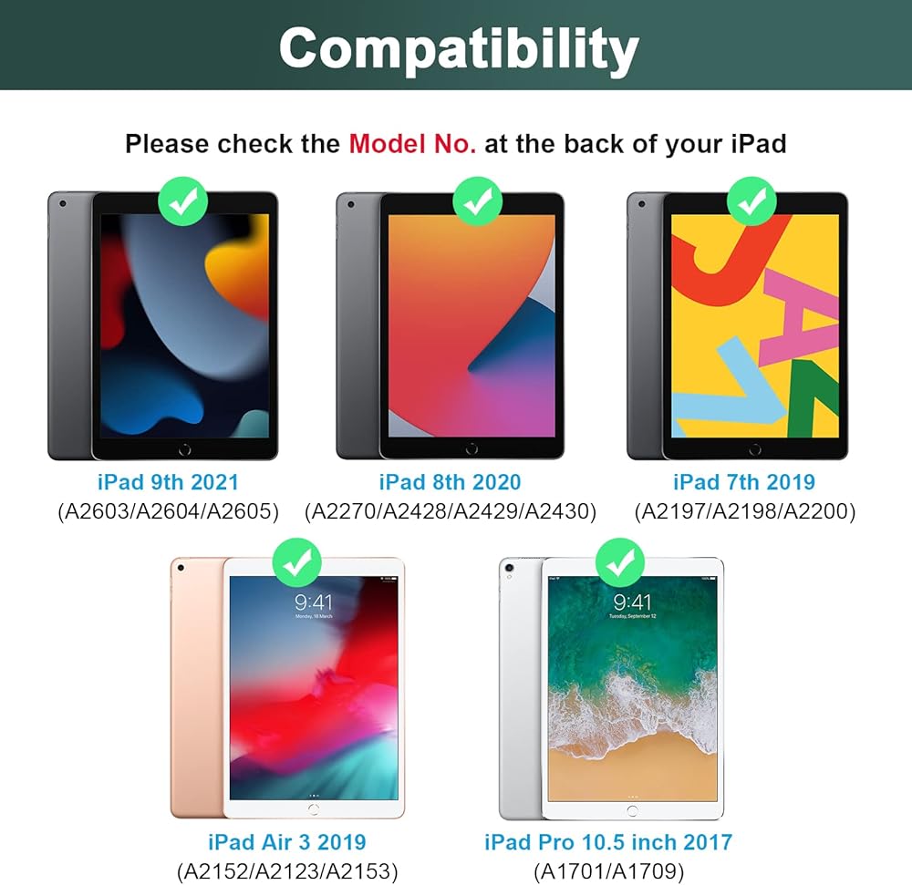 Compatibility:The case is designed for iPad 10.2&10.5 inch, which is compatible with the latest iPad 9th 2021 (A2603/A2604/A2605),2020 iPad 8th genneration (A2270/A2428/A2429/A2430) / iPad 7th generation 10.2 inch 2019 (A2197/A2198/A2200), iPad Air 3 2019 (A2152/A2123/A2153), iPad Pro 10.5 inch 2017 (A1701/A1709). Not compatible with any other iPad models. ✘ Reminds: Please check the "Axxxx" logo on the back of the iPad before purchasing.