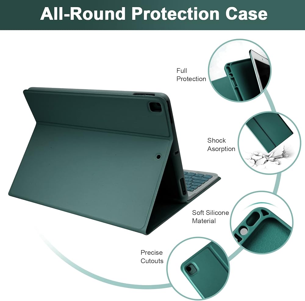 SOPPY Bluetooth Keyboard Case with Mouse for iPad 9th Gen 2021, 8th Gen 2020, 7th Gen 2019 10.2", Air 3 & Pro 10.5", Detachable Wireless Keyboard, Slim Protective Cover, Rechargeable, Dark Green