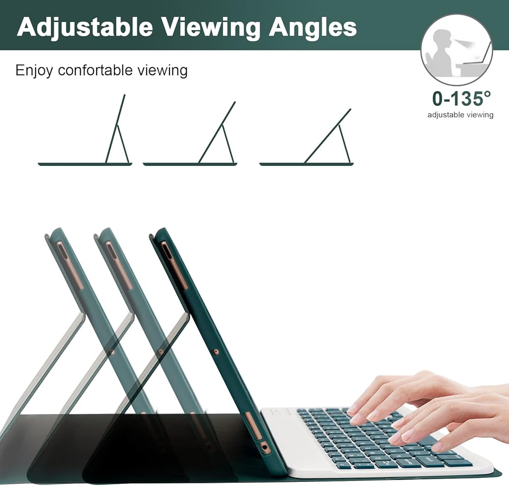 Detachable & Adjustable:Designed to stand your iPad hands free so you can focus on work, reading, watching videos, typing like on normal computer laptop. Innovative magnetically detachable wireless keyboard design makes it easy to use(the connection range is up to 10 M). And iPad protective case can be adjusted to different angles according to your needs, provides more comfortable feeling of use.