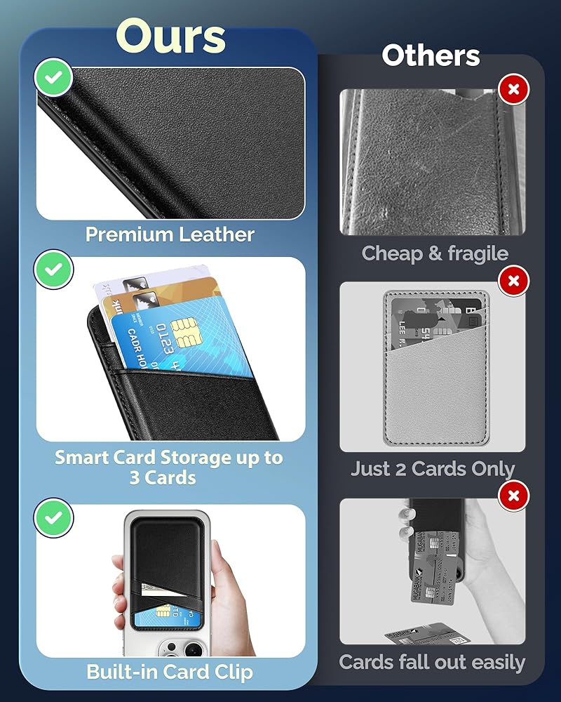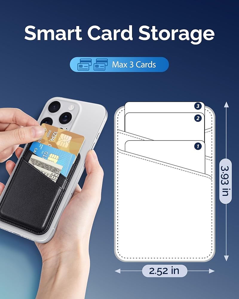 STRONGER MAGNETS, SAFER HOLD: Our leather magnetic phone card holder shines! Featuring strong N52 magnets with 4000Gs force, it firmly attaches to iPhones or MagSafe cases, avoiding falls. It slides in and out of pockets with ease.