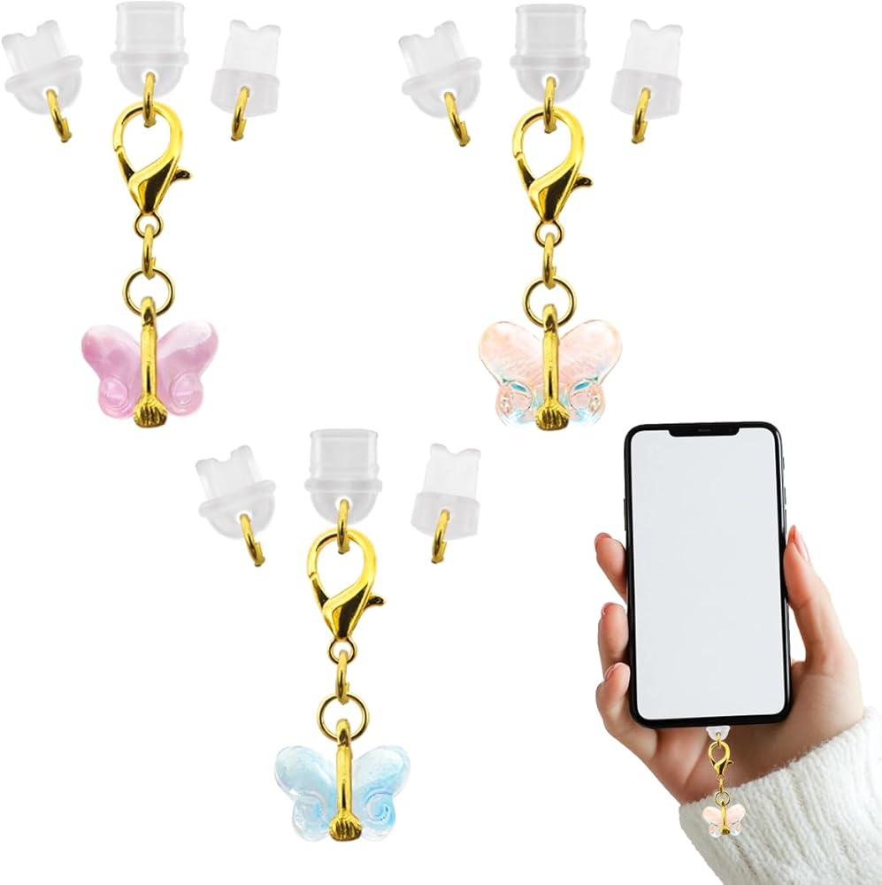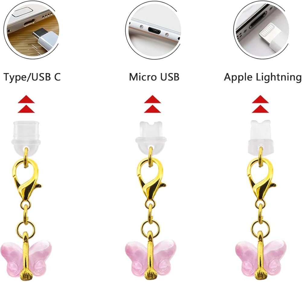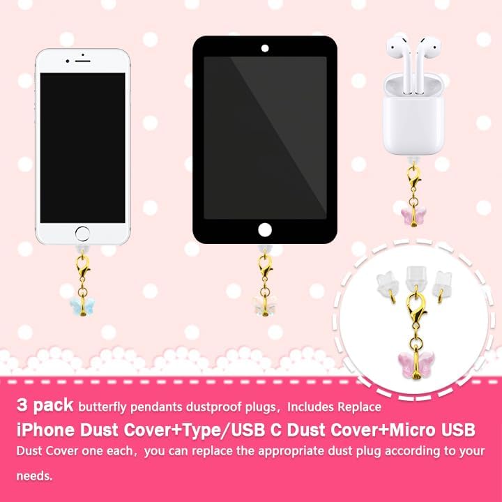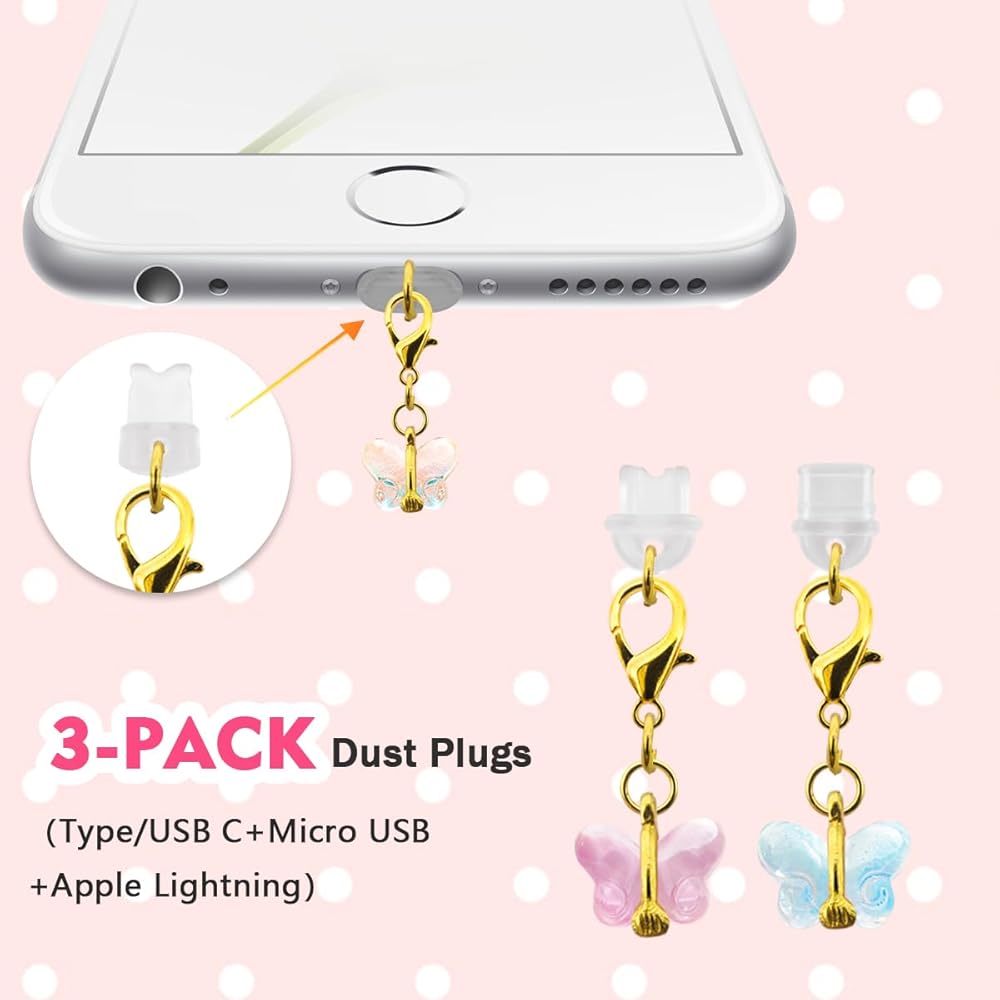 【Package Includes】:You will receive 3 pcs butterfly pendants dustproof plugs,Includes Replace iPhone Dust Cover+Type/USB C Dust Cover+Micro USB Dust Cover one each,you can replace the appropriate dust plug according to your needs.