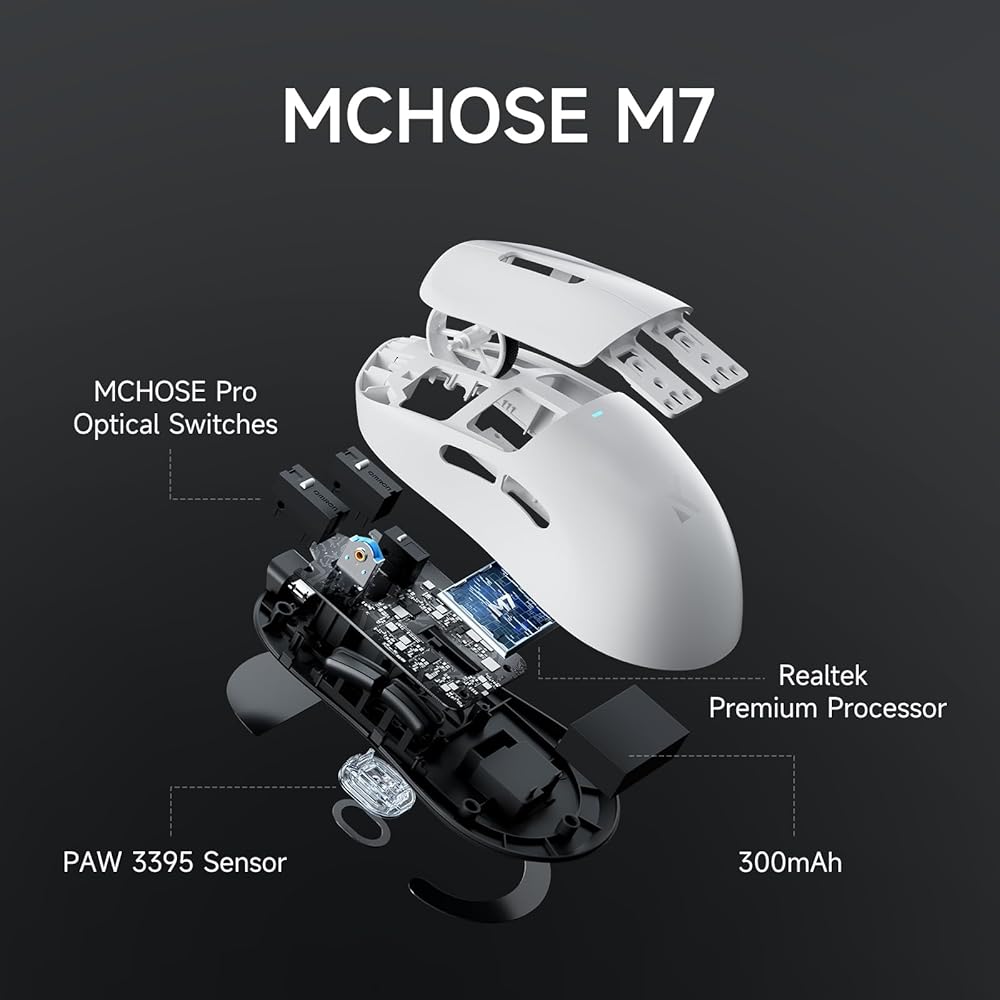 【MCHOSE PRO optical switches】Featuring specially tuned MCHOSE PRO optical switches, the M7 series minimizes double-click errors and ensures swift response times. Enjoy a crisp feel and rapid rebound, providing reliable performance during both extended training sessions and high-stakes competitions.