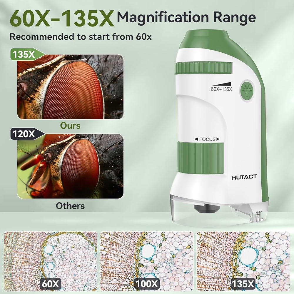 60x-135x Adjustable Pocket Microscope: This small microscope offers adjustable magnification from 60x to 135x, allowing for clear observation of mini organisms, plants, trichomes, and insects.