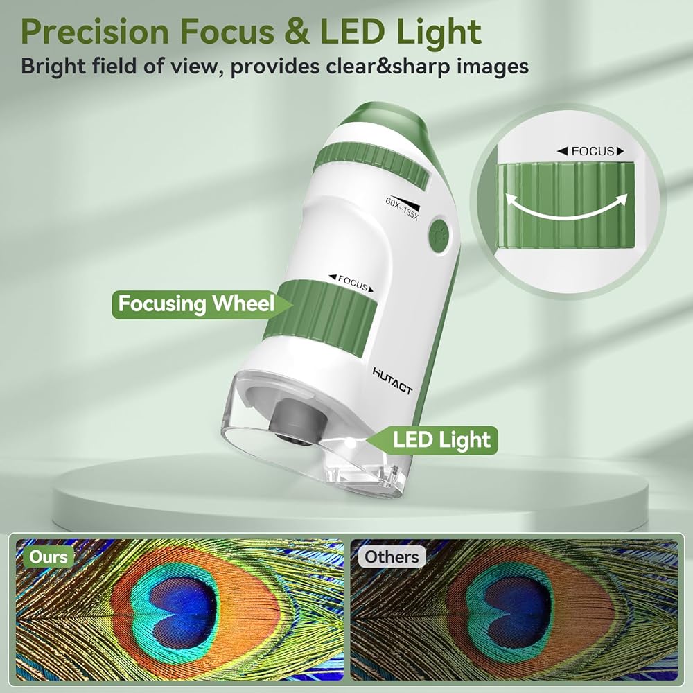 Bright LED for Clear Viewing: This miniature lightweight microscope features a built-in LED light, delivering bright and clear illumination for detailed exploration of feathers, flowers, and other small objects.