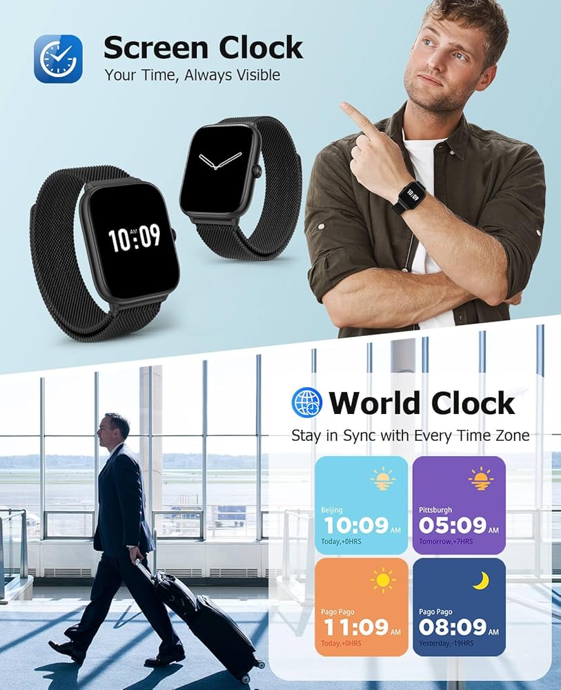 LONG-LASTING BATTERY & PRACTICAL FEATURES – Enjoy 5-7 days of daily use or up to 30 days of standby with the fast-charging 340mAh battery. Packed with convenient features like music control, an upgraded alarm clock with ringtone reminders, weather updates, a calculator, remote photography, and more. This smart watch is the ultimate companion for work, fitness, and leisure.