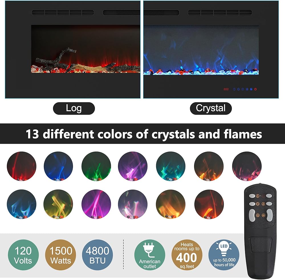 Function: Crystal carbon bed+realistic logs carbon bed, 13 3D flame colors and 13 ember bed colors, 65 models optional