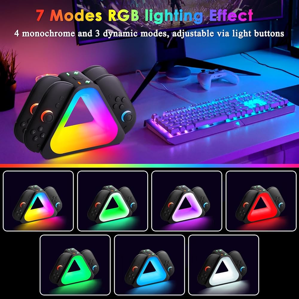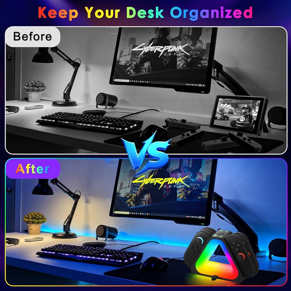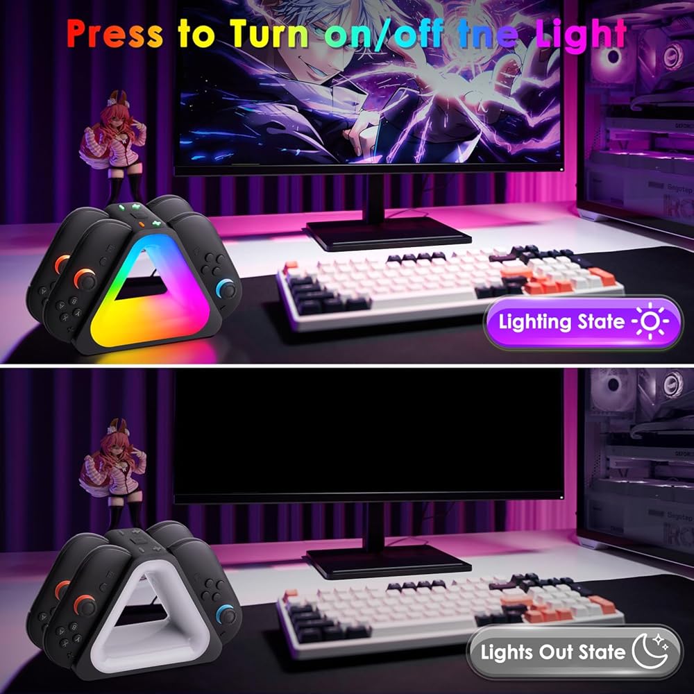 1. Efficient Charging and Compatibility: Compatible with Switch 2, up to 4 controllers can be charged at the same time. Each Joy-Con is equipped with a separate LED indicator to show real-time battery status. Easily slide into the NS2 game stand or Joy Con controllers to provide a convenient charging experience.