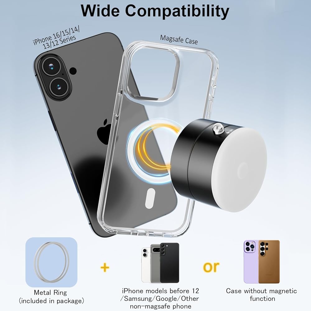 Compatibility: imluckies vacuum suction cup magnetic phone holder mount is designed for iPhone 16 Pro Max / 16 Plus / 16 Pro / 16 / 15 14 13 12 Mini series, compatible with magsafe cases and other phones or cases with metal ring attached. It can be used for filming, vlogging, car, bathroon, shower, makeup, mirror, glass, smooth tile, glossy Painted wall, smooth steel, acrylic plate. There is an auxiliary plate inside the package, if the location you want to use is not part of the above smooth material, then just stick the auxiliary plate on the location you want to adsorb first, then you can use the cell phone holder suction cup.