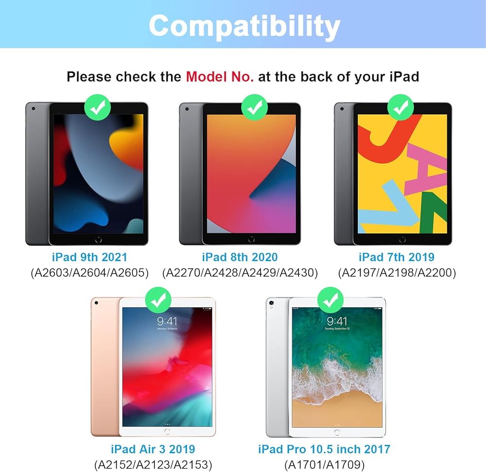 Compatibility:The case is designed for iPad 10.2&10.5 inch, which is compatible with the latest iPad 9th 2021 (A2603/A2604/A2605),2020 iPad 8th genneration (A2270/A2428/A2429/A2430) / iPad 7th generation 10.2 inch 2019 (A2197/A2198/A2200), iPad Air 3 2019 (A2152/A2123/A2153), iPad Pro 10.5 inch 2017 (A1701/A1709). Not compatible with any other iPad models. ✘ Reminds: Please check the "Axxxx" logo on the back of the iPad before purchasing.