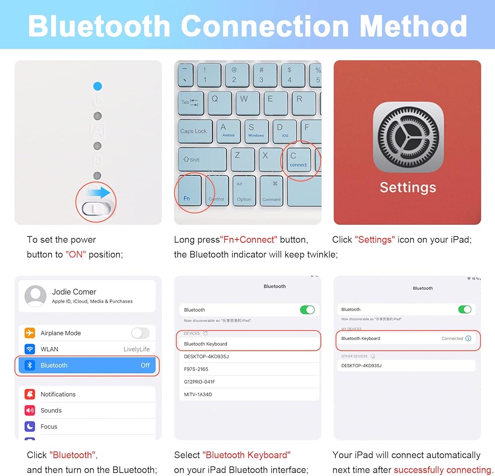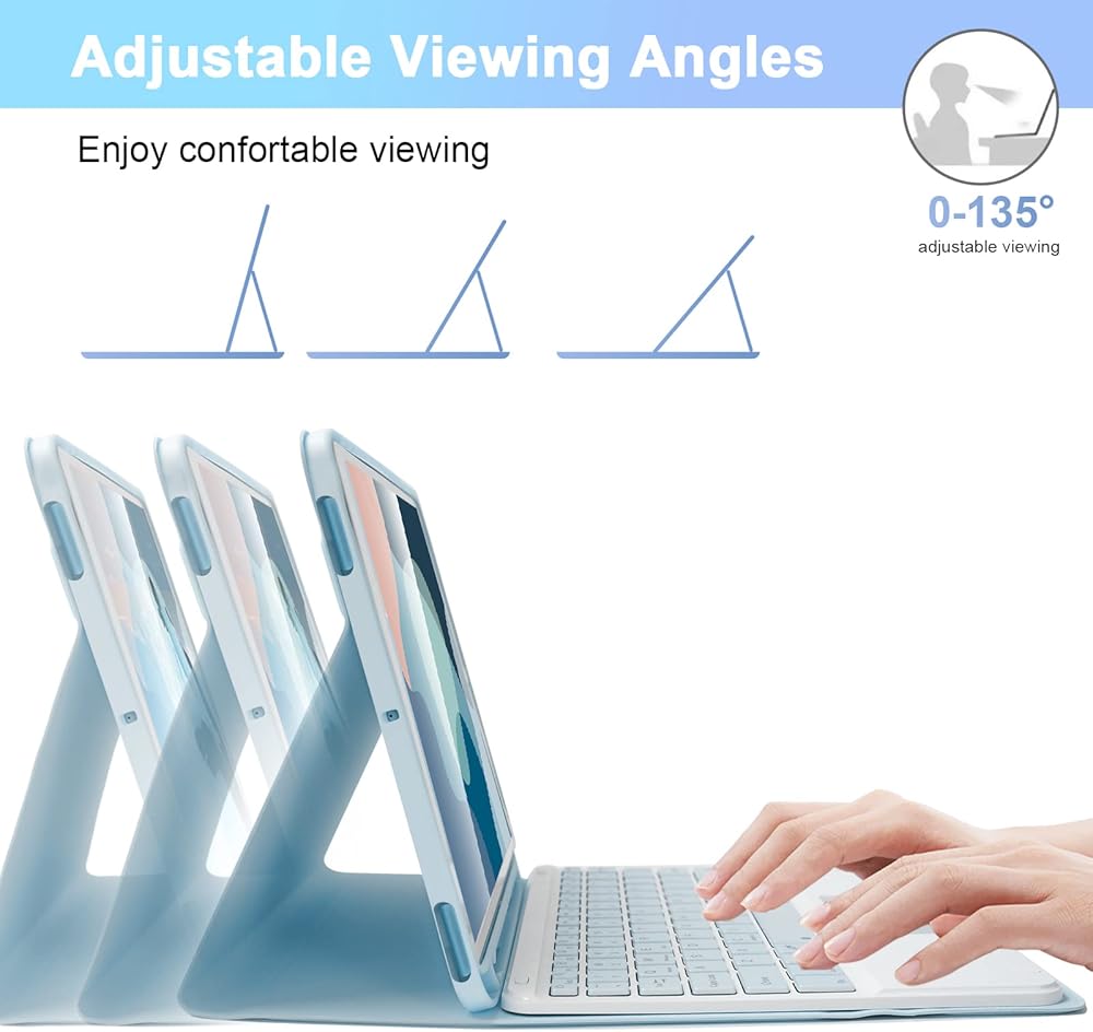 Detachable & Adjustable:Designed to stand your iPad hands free so you can focus on work, reading, watching videos, typing like on normal computer laptop. Innovative magnetically detachable wireless keyboard design makes it easy to use(the connection range is up to 10 M). And iPad protective case can be adjusted to different angles according to your needs, provides more comfortable feeling of use.