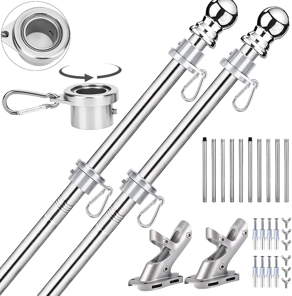 2 Pack Flag Poles for Outside House, 6 FT Flag Pole Kit with No-Tangle Aluminum Ring Clips and Holder Mounting Bracket, Stainless Steel 1 inch Diameter Flagpole for Boat Deck Porch (2 Pack)