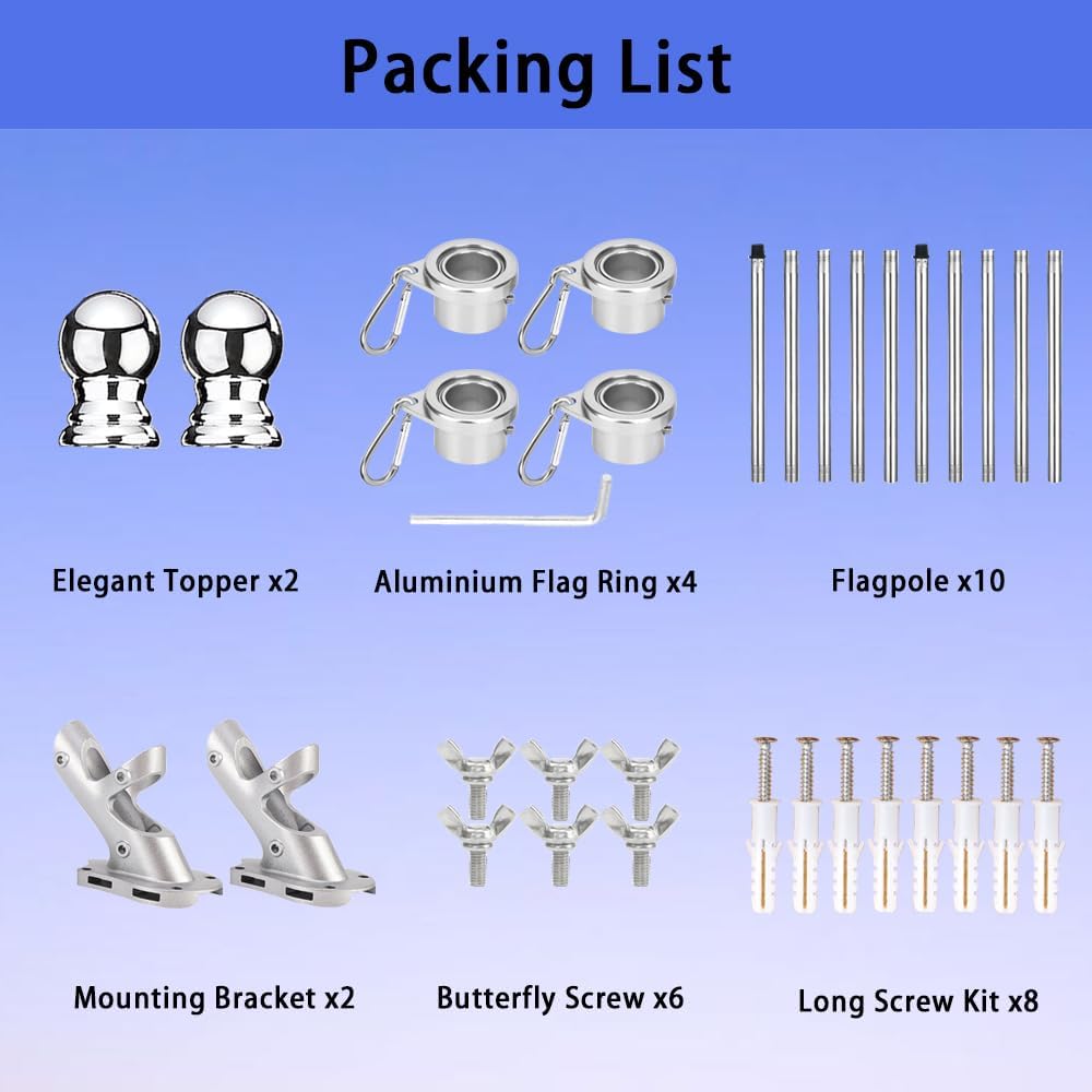 What You Get: You will get a complete set of 6 feet 1" diameter flag pole kit; Including 5 sections of 1.3 ft flag poles; 2 Aluminum flag rings and clips; 1 Flag pole holder; 1 Elegant topper; 1 Instruction manual; Geat flag poles for outside house