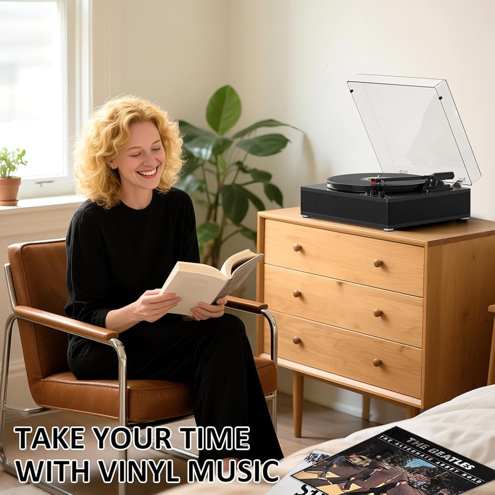 【Built-in Stereo Speakers】The vintage turntable built-in two professionally-tuned 78mm full-range stereo speakers delivers impressively rich and clear sound, while the back comes with Bass Reflex System for fuller, more powerful bass. Enjoy every layered song with crystal-clear highs and beastly powerful bass