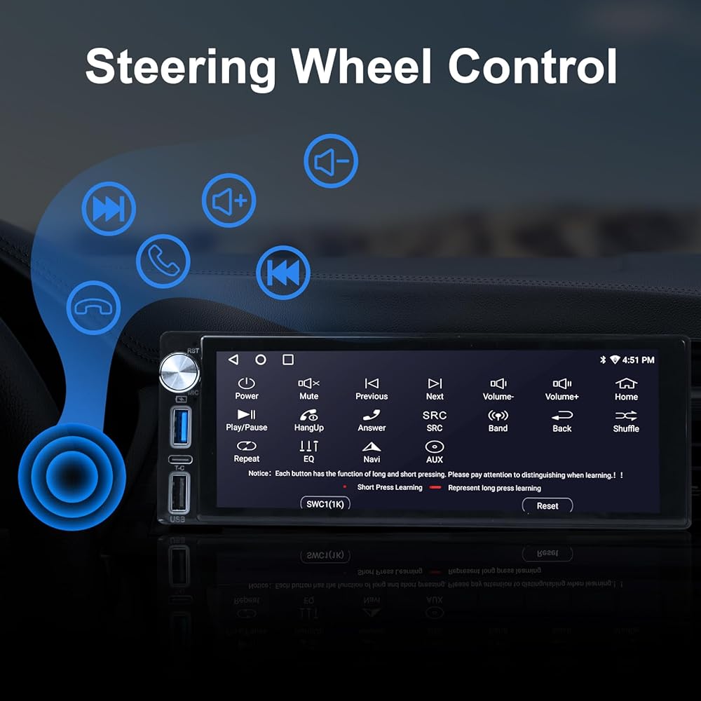 【Single Din Android Auto and Upgrade BlueTooth 5.1】Our single din CarPlay stereo is equipped with State of Art Voice Control and picks up your voice more clearly. Enhanced Listening Experience, lets you play and control music apps and make calls hands-free. Easily change up your music with your existing Steering Wheel Controls or the Touchscreen.