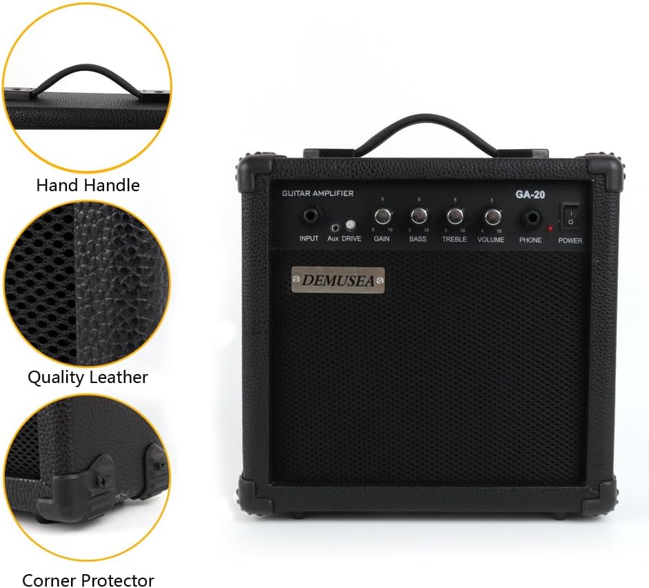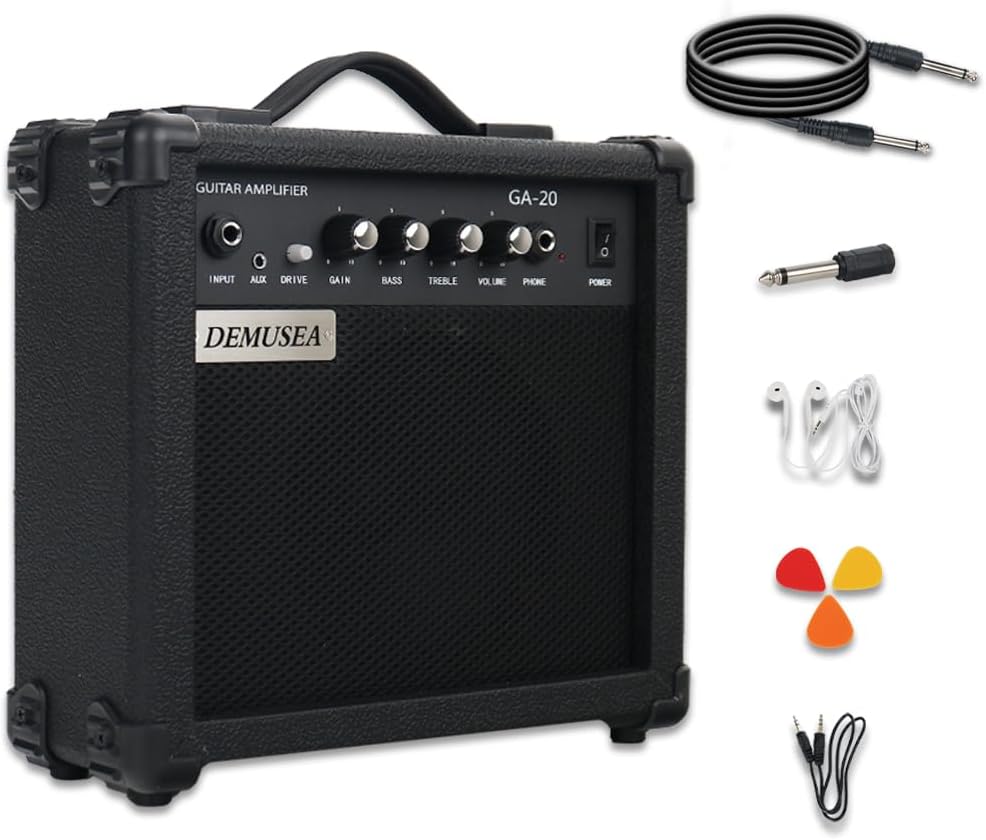 Demusea 20W Pro Watt Electric Guitar Amplifier Amp Practice Small Portable Travel Mini with Headphone Jack Aux Distortion Gain Treble Bass Volume Jack with 3 Meters Cable Audio Adapter Guitar Picks