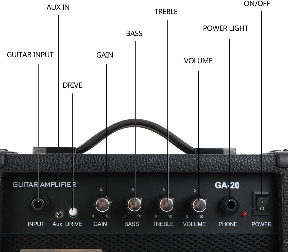 Multi-Function: 20w Amp with gain,bass,treble,volume,guitar input and aux in,use tthe 6.5mm to 3.5mm adapter we offered,practice in silence with headphone,enjoy your music in your style