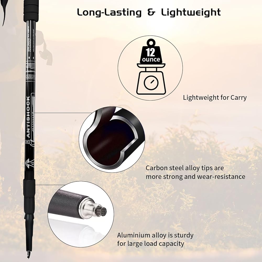 Premium Materials: Body of these trekking poles are crafted from well-constructed aluminum alloy, offering a perfect balance of strength and lightness, making them easy to carry on your outdoor adventures. The carbon-steel alloy tips are wear-resistant, ensuring long-lasting performance even on rough and challenging terrain.
