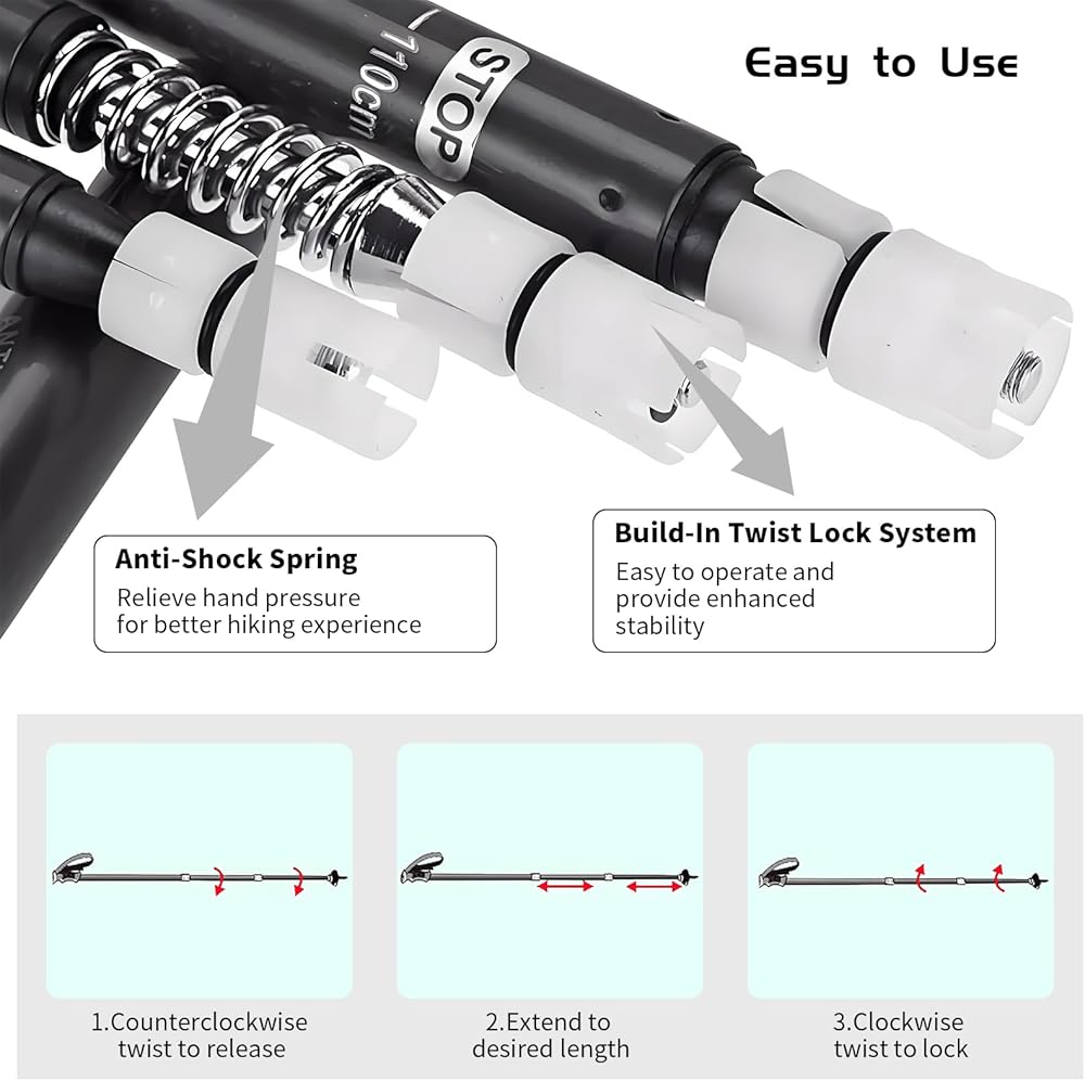 Twist Lock & Absorb-Shock Spring: This pair of 3-section trekking poles for hiking features a twist-locking system, making it easy to adjust to your desired length and providing enhanced stability and secure fixation. Simply twist clockwise to lock and counterclockwise to release. The absorb-shock spring can relieve stress on hands and improve hiking experience.