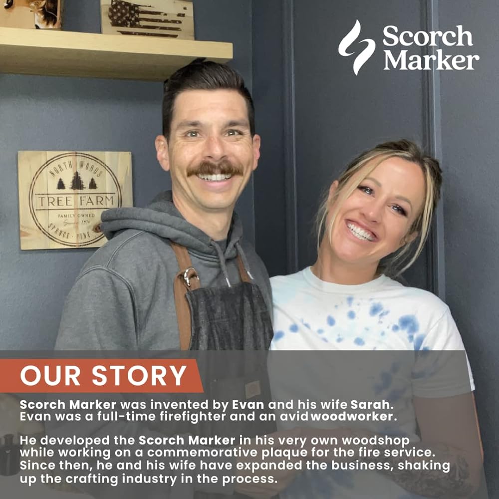 MADE IN THE USA: Scorch Marker is a family-owned business that's shaking up the craft industry. Evan developed Scorch Marker in his own woodshop. Now he and his wife, Sarah, are helping put the power of woodburning in everyone's hands. They love to see customers' creativity and projects!