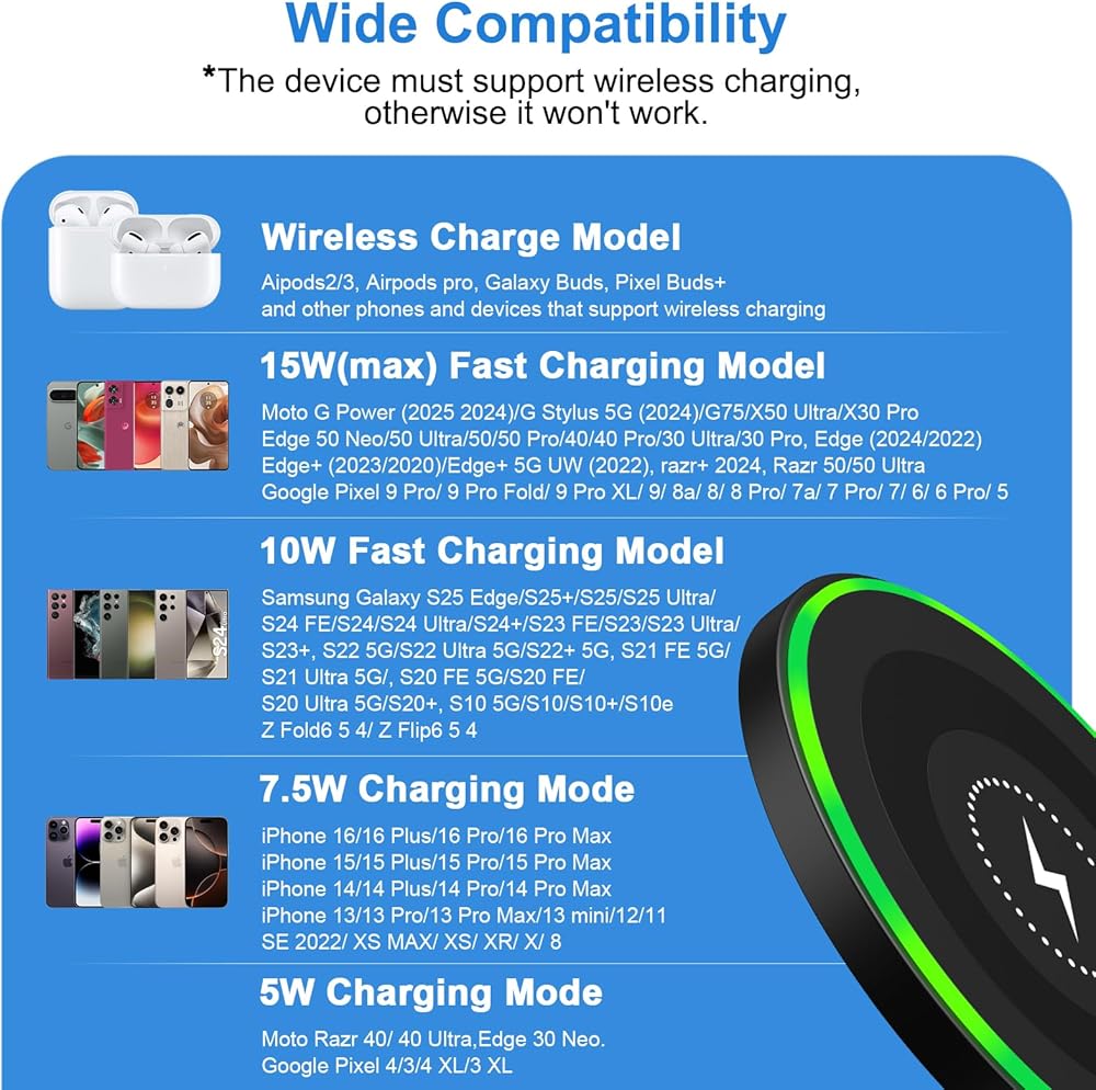 2.Wireless charging is not supported on iPhone 6 series, iPhone 7 series and Samsung A series, Samsung Galaxy S10 Lite, Google Pixel 6a, and Moto Razr 2022, G Stylus 5G 2023 2022 2021, G Power 2022 2021, G Power 5G, G 2024 2023 2022, G Play, G (2025), Edge 50 Fusion, Edge 40 Neo, Edge 60 Fusion, Edge X30, Edge 30, Edge 30 Fusion, Edge (2021), Edge 5G UW (2021), etc.