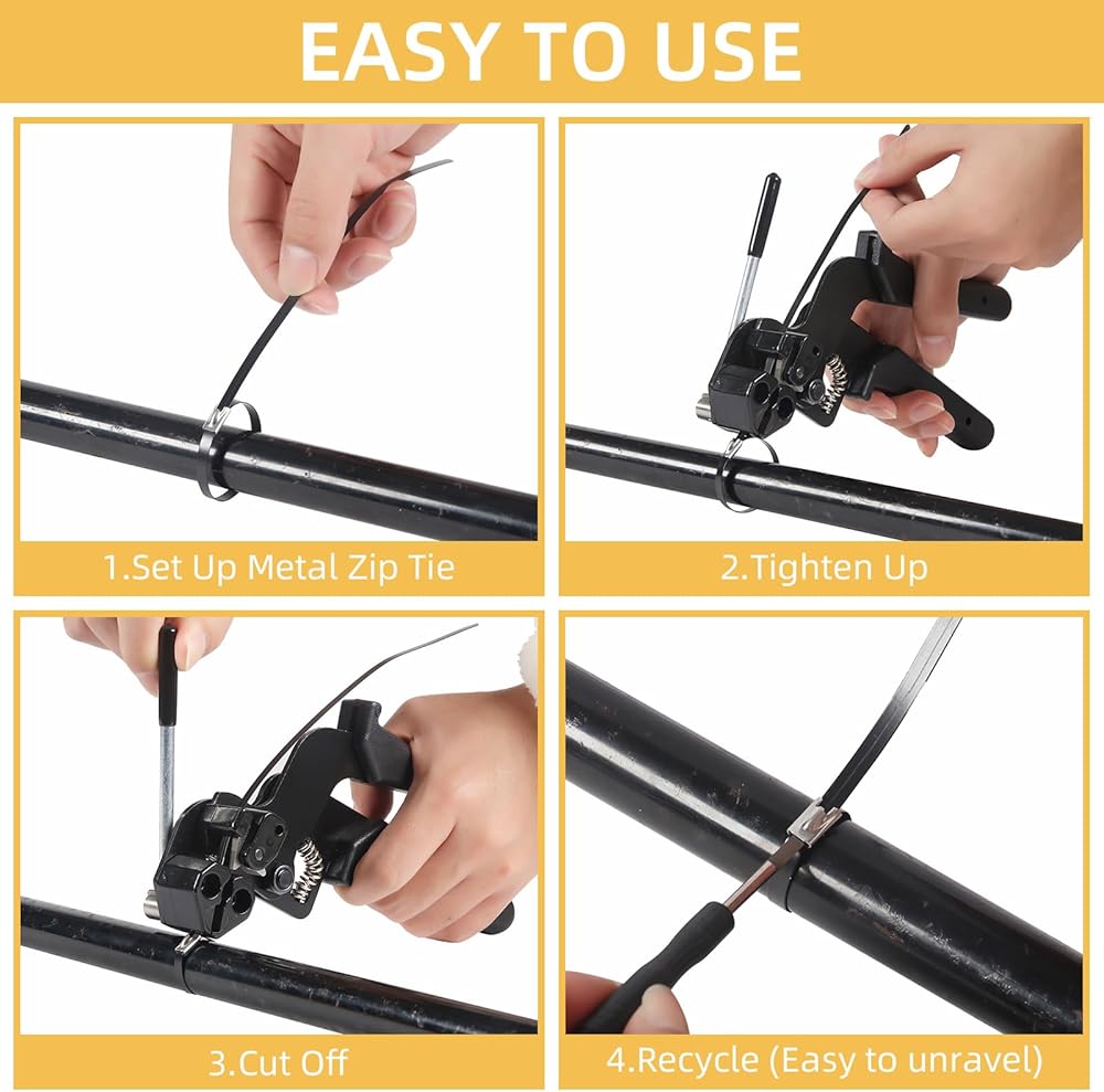 Package includes: 300 x 11.8 In Metal Zip Ties; 1 x Stainless Steel Cable Tie Gun; 1 x Metal Scissors; 1 x Metal Cable Tie Remover; 2 x Industrial Gloves