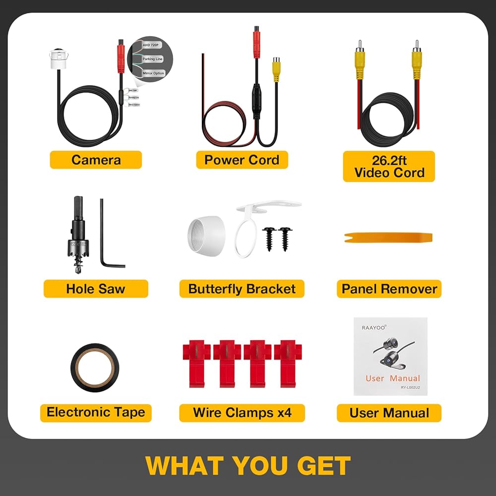 【Installation Tools & Accessories Included】 1 x 26ft Double Shielded Video Wire;1 x 5ft Camera Power Wire; 1 x Camera Mount and Screws; 1 x Panel Removal Tool; 4 x Wire Clamps; 1 x Electrical Tape; 1 x 18.5mm Hole Saw; 5 x Zip ties; 1 x RAAYOO Camera; 1 x COLOR User Manual with Pics