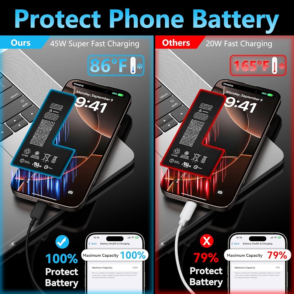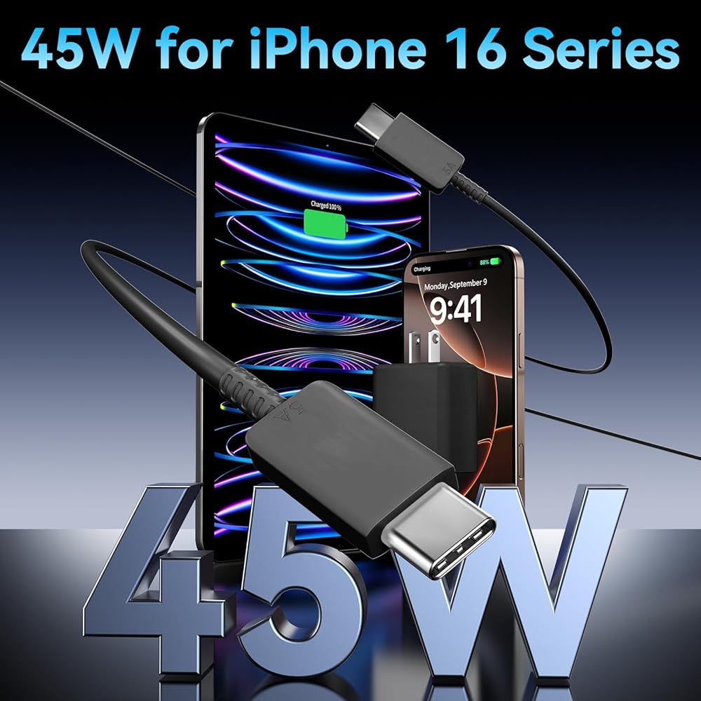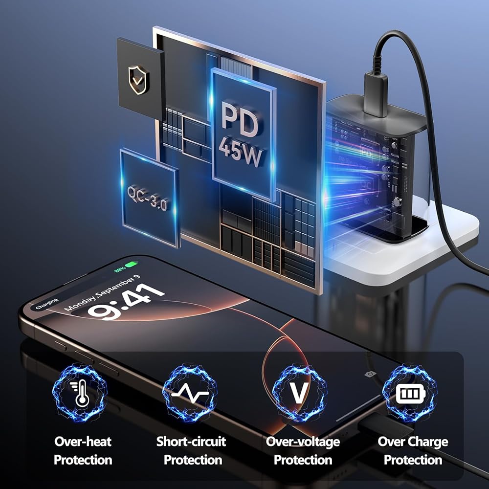 【Superior Safety Fast Charging】45 watt iPhone 16 fast charger provide intelligent circuit design to keeps your iPhone 16 be safe from over-current over-voltage over-heating , short-circuiting, exhaustive protection while charging.