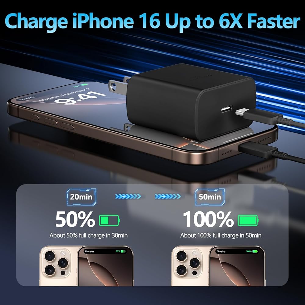 【45W Super Fast iPhone 16 charger】Our more powerful 45W USB C iPhone 16 charger using the PD 3.0 fast charging technology provides maximum 45 Watt output power, super fast charge iPhone 16/16 Plus/16 Pro/16 Pro Max up to 80% in just 30 minutes, 60% faster than original 20W charger.