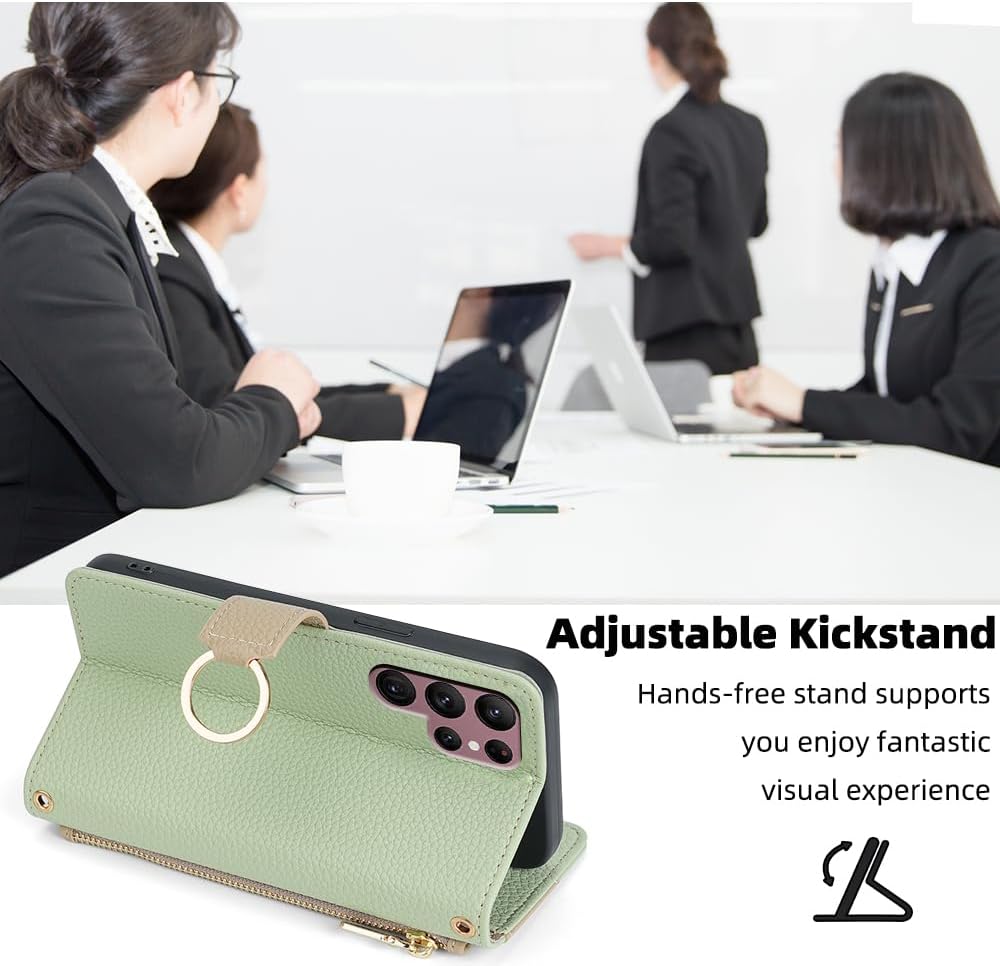 Asuwish Phone Case for Samsung Galaxy S22 Ultra 5G Wallet Cover with Screen Protector and Mirror Flip Cover Ring Credit Card Holder Crossbody Strap Stand Cell S22ultra 22S S 22 S22ultra5g 6.8 Green
