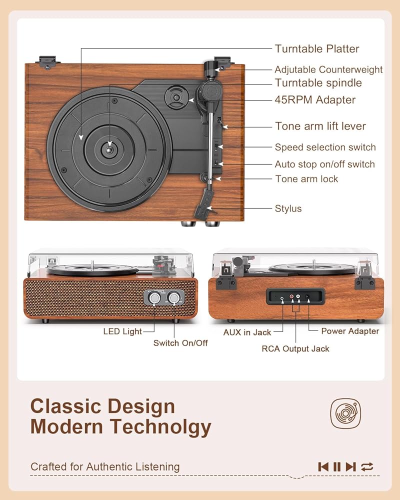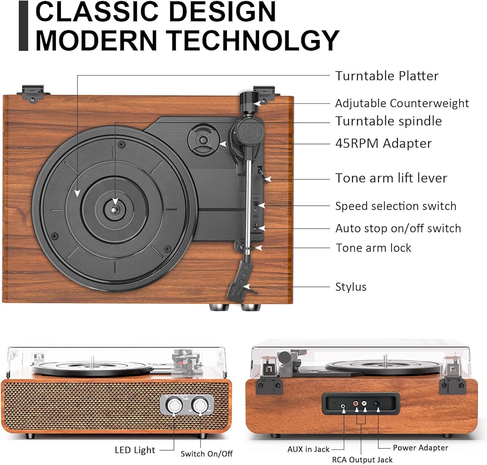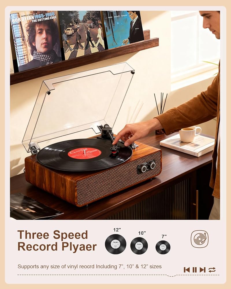 【Belt-drive 3-Speed Vinyl Player】With a 45 rpm adapter and extra stylus, it ensures accurate tracking and flawless sound for all your 7", 10", and 12"vinyl records, by three adjustable speeds—33 1/3 rpm, 45 rpm, and 78 rpm
