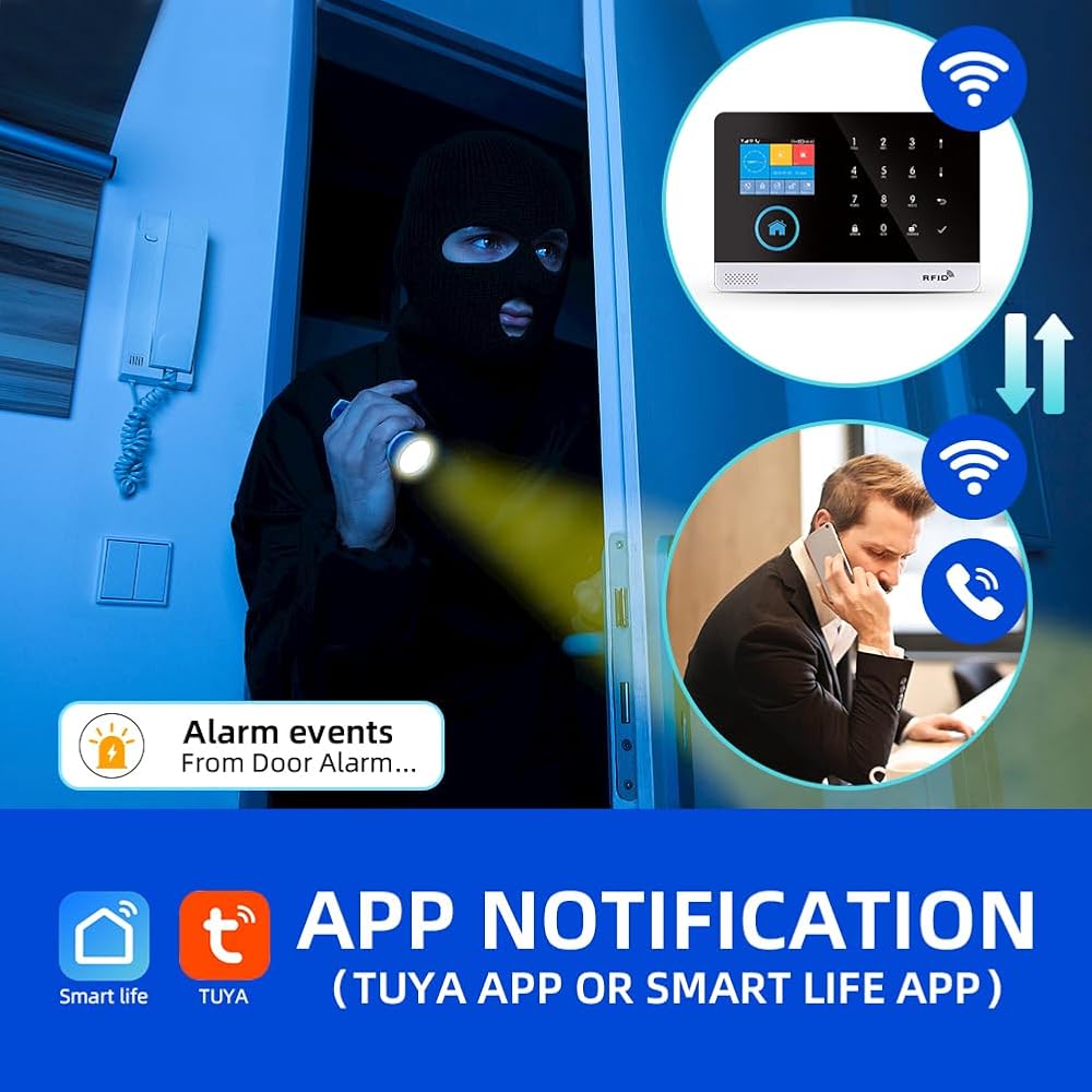 [ Anti-theft Protection ]: When someone triggers the system, it will sound a loud alarm to scare off thieves, and “Tuya” or "Smart life” app will push information to you, the alarm host will make a call or send a message to the preset phone number.
