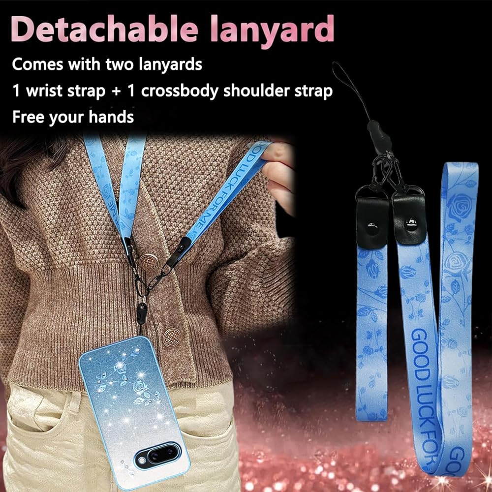 for Google Pixel 9A Case, Glitter Floral Clear TPU Cover with Crossbody Lanyard Wristband Shoulder Strap, Bling Sparkle Phone Case for Women Girls Pixel 9A YSS Blue