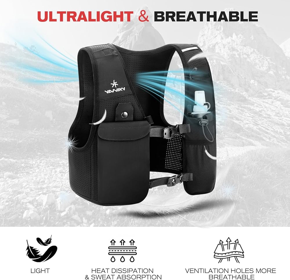Featherlight & Breathable: The running vest is crafted from neoprene, with the main fabric composed of 88% nylon, 7% polyester, and 5% spandex. Its lightweight design ensures runners can wear it for extended periods without fatigue, delivering unmatched comfort and flexibility during runs. The strategically placed ventilation holes accelerate air circulation and enhance moisture-wicking, keeping you cool and dry.