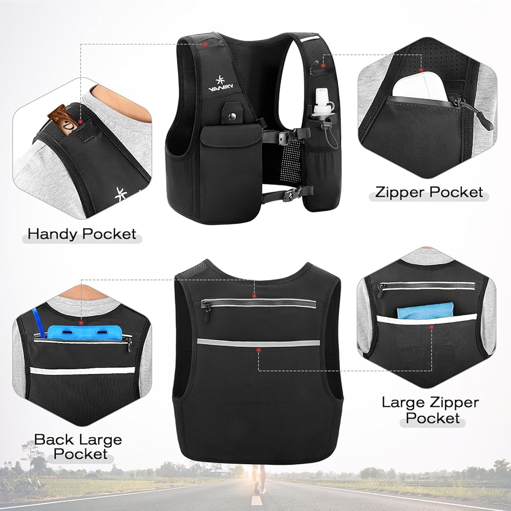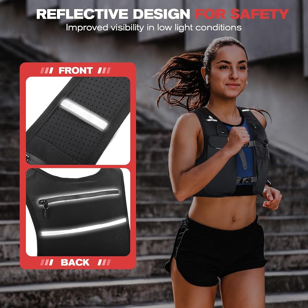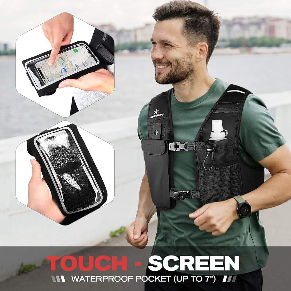 Versatile Storage Options:This hydration vest features zippered and mesh pockets to store your energy gels, snacks, keys, towel, and other essentials. The transparent, touchscreen-friendly, and waterproof phone pocket lets you take calls and reply to messages without removing your phone. Plus, its spacious back zippered compartment fits up to a 2-liter hydration bladder, keeping you hydrated during long activities.