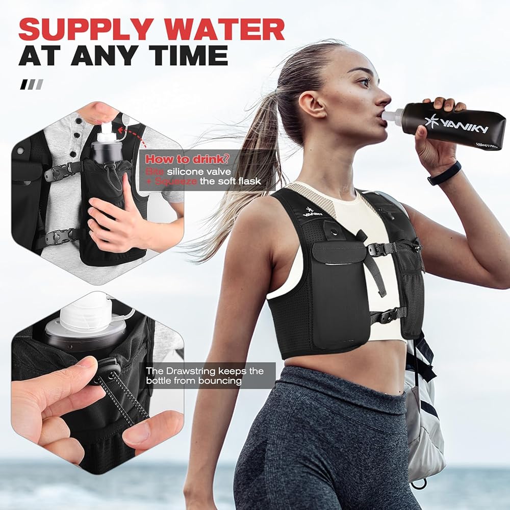 Keep Hydrated on the Go:This running hydration vest comes with a 500ml collapsible soft flask, 100% free of BPA and PVC. No need to remove the bottle – just bite and gently squeeze to hydrate effortlessly. As you drink, the bottle shrinks, and together with the drawstring tightening system, it minimizes sloshing and bouncing. The leak-proof design ensures no spills, making it the perfect choice for marathons and long-distance adventures.